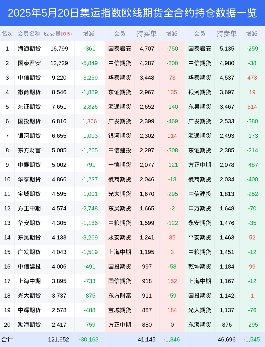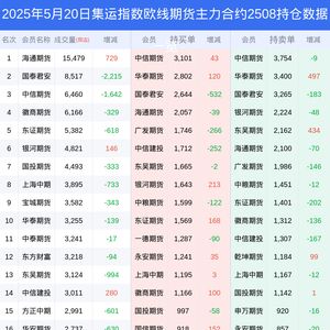 新浪期货 根据交易所数据,截至5月20日收盘主力合约集运指数欧线期货2508,涨跌-2.80%,成交量7.83万手,持仓数据显示前20席位呈现净空,差额头寸为1953手。