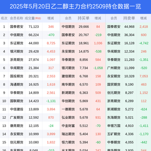新浪期货 根据交易所数据,截至5月20日收盘主力合约乙二醇2509,涨跌-1.56%,成交量32.26万手,持仓数据显示前20席位呈现净空,差额头寸为30602手。