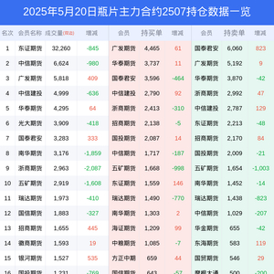 新浪期货 根据交易所数据,截至5月20日收盘主力合约瓶片2507,涨跌-1.67%,成交量5.35万手,持仓数据显示前20席位呈现净空,差额头寸为2295手。