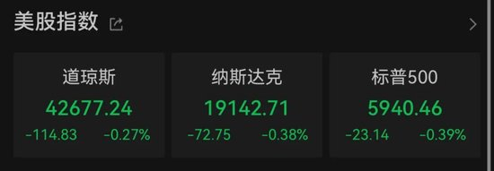 Wind数据显示,道指跌114.83点,跌幅为0.27%,报42677.24点;纳指跌72.75点,跌幅为0.38%,报19142.71点;标普500指数跌23.14点,跌幅为0.39%,报5940.46点。