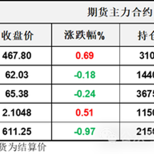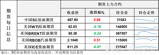 【1】WTI主力原油期货收跌0.11美元,跌幅0.18%,报62.03美元/桶;布伦特主力原油期货收跌0.16美元,跌幅0.24%,报65.38美元/桶;INE原油期货收涨0.69%,报467.8元。