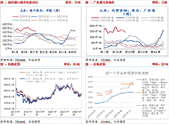 从价格角度来看,近一个多月玉米现货价格维持强势,带动玉米期货先涨后跌,期货升水大幅修复,截至5月16日基差收缩至-15。从局部价差来看,潍坊二等玉米市场价-锦州港二等玉米平仓为70,考虑运费降低,东北地区发往华北地区仍顺价,蛇口港市场价-锦州港平仓价为90,并不顺价。从替代品市场来看,当前小麦-玉米价差回收至100,局部地区玉米价格接近小麦价格,限制玉米涨幅。由此来看,价格上行空间有限。对于近期玉米回调的空间和幅度来看,由于产需缺口存在,叠加短期谷物进口对缺口弥补的可能性降低,玉米下方空间有限,从技术面来看,2300-2320是重要的支撑位。