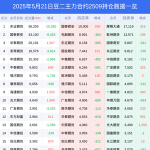 新浪期货 根据交易所数据,截至5月21日收盘主力合约豆二2509,涨跌+1.57%,成交量15.26万手,持仓数据显示前20席位呈现净空,差额头寸为13685手。