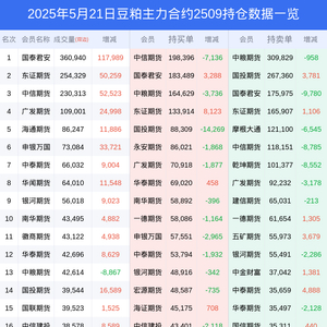 新浪期货 根据交易所数据,截至5月21日收盘主力合约豆粕2509,涨跌+1.91%,成交量128.84万手,持仓数据显示前20席位呈现净空,差额头寸为309747手。