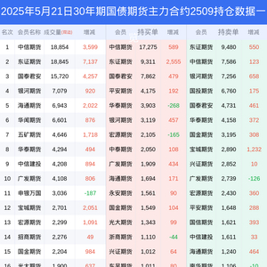 新浪期货 根据交易所数据,截至5月21日收盘主力合约30年期国债期货2509,涨跌-0.08%,成交量7.34万手,持仓数据显示前20席位呈现净空,差额头寸为1463手。