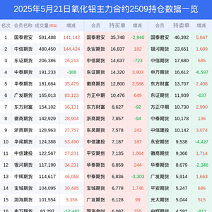 新浪期货 根据交易所数据,截至5月21日收盘主力合约氧化铝2509,涨跌+3.11%,成交量248.32万手,持仓数据显示前20席位呈现净空,差额头寸为30404手。
