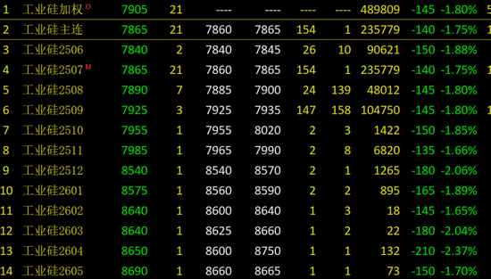 跌破8000元/吨重要关口后,工业硅价格仍未止跌。5月21日,工业硅期货主力合约SI2507盘中创上市以来新低7830元/吨,报收7865元/吨,下跌1.75%(见下图)。