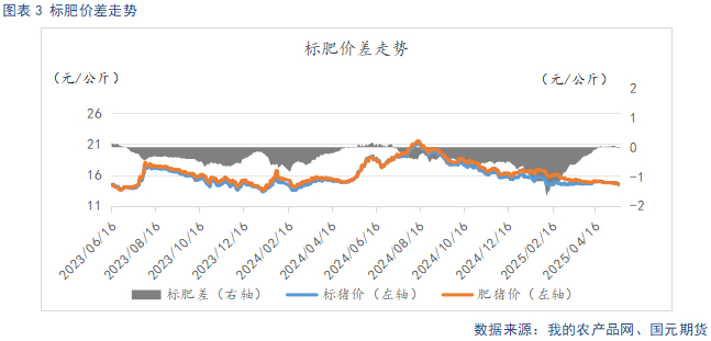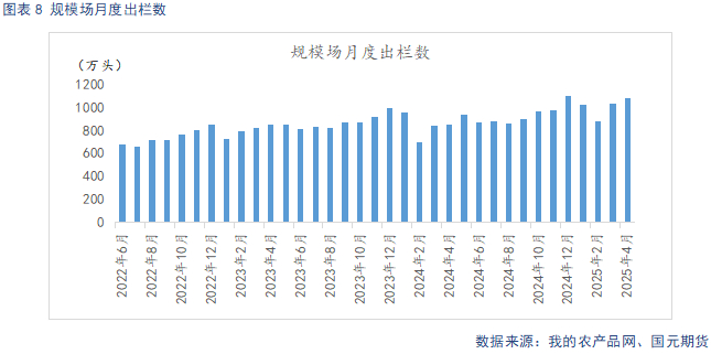 据Mysteel统计,截止2025年4月底,规模场能繁母猪存栏量为506.68万头,环比上调0.36%,同比增长4.31%。4月猪价平稳运行,养殖端仍有一定利润空间,去产能意愿不强,能繁母猪存栏延续增长趋势。自24年4月起,养殖利润回暖支撑下,规模场产能逐步回升,从生产周期推算,2025年规模场理论产能呈现环比上升态势。规模场4月商品猪存栏数为3548.24万头,环比增加0.1%,同比增加6.28%。规模场4月商品猪出栏量为1085.65万头,环比增加4.46%,同比增加26.58%。4月标肥价差逐步缩窄,大猪价格优势不再,认卖情绪升温,规模场完成当月出栏计划。5月,前期压栏、二育猪源陆集中出栏压力较大,出栏量有望延续增长。