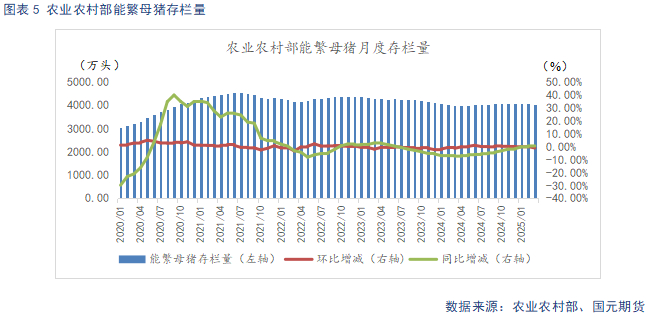 根据农业农村部数据显示,2025年3月末全国能繁母猪存栏量4039万头,同比上升1.2%,环比下降1%,根据农业农村部新修正的《生猪产能调控实施方案》,当前能繁存栏相当于正常保有量的104.6%,处于绿色偏高区域。24年12月至25年3月期间,能繁母猪存栏有所去化,不过24年4月至24年11月,能繁母猪存栏逐月环比回升,以生产周期推算,25年前三季度处于产能兑现期。