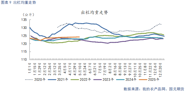 截止5月19日,生猪出栏均重124.12公斤,较上周持平。当前出栏均重处于近四年高位,单头生猪提供的肉量增加,随着气温不断升高,养殖端加快大猪出栏速度,供给端面临量重双高的局面。