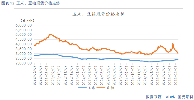 截止5月20日,玉米现货均价2375.2元/吨,较上周环比上涨1.87元/吨,豆粕现货均价3011.14元/吨,较上周环比下跌161.72元/吨。近期玉米价格小幅上行,豆粕价格持续回落,饲料原料价格整体走弱。玉米从基本面看,进口锐减使市场更依赖国内粮源。粮源集中在贸易环节,流通压力加大。华北新麦上市在即,小麦替代优势显现。深加工需求疲软,玉米上方压力较大。豆粕从基本面看,尽管4月巴西大豆供应逐步恢复,但运输周期导致1-4月国内进口量仍低于往年。当前因油厂开机恢复初期压车严重,部分限量停单,供应恢复偏慢。不过,下游饲料企业提货积极,养殖需求稳健对现货价格形成支撑,短期豆粕预计趋稳运行。