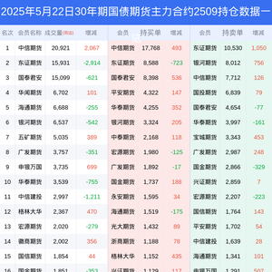 新浪期货 根据交易所数据,截至5月22日收盘主力合约30年期国债期货2509,涨跌-0.04%,成交量6.76万手,持仓数据显示前20席位呈现净空,差额头寸为2110手。