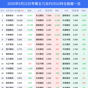 新浪期货 根据交易所数据,截至5月22日收盘主力合约苹果2510,涨跌-1.83%,成交量9.59万手,持仓数据显示前20席位呈现净空,差额头寸为7384手。