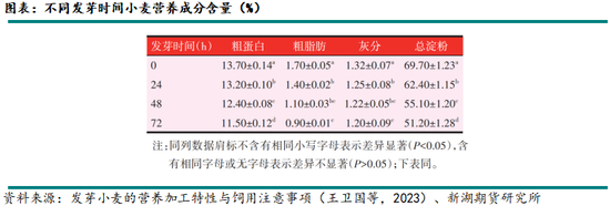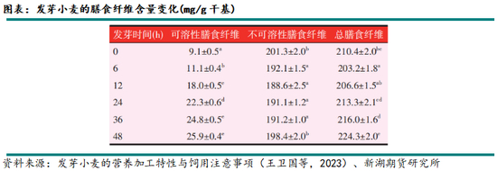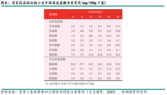 芽麦的蛋白质含量明显低于正常小麦,氨基酸含量有所升高,发芽可使小麦的总膳食纤维含量呈总体上升趋势。有研究表明,小麦种子萌发96小时后,可溶性蛋白质含量下降了30%左右。