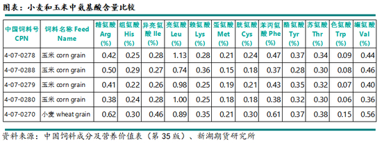 小麦中除亮氨酸含量略低外,其余必需氨基酸含量均高于玉米。根据2024年发布的第35版中国饲料成分及营养价值表数据显示,小麦赖氨酸含量为0.35%,仅略低于高赖氨酸品种玉米(0.36%),相当于1级玉米赖氨酸含量的125%;色氨酸含量相当于玉米的167%-250%。这些氨基酸在动物生长过程中起着关键作用,使用小麦能更好地满足动物对氨基酸的需求,保证动物体内氨基酸的平衡。