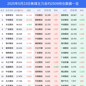 新浪期货 根据交易所数据,截至5月23日收盘主力合约焦煤2509,涨跌-4.01%,成交量49.13万手,持仓数据显示前20席位呈现净空,差额头寸为58468手。