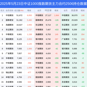 新浪期货 根据交易所数据,截至5月23日收盘主力合约中证1000指数期货2506,涨跌-1.30%,成交量16.71万手,持仓数据显示前20席位呈现净空,差额头寸为15701手。