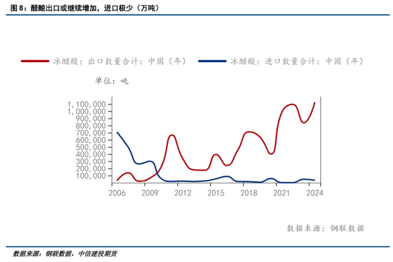 在中国难有明显的需求增量之下,国内每年冰醋酸出口逐年放量,寻求海外新市场的扩张。根据中国海关总署统计的数据显示,近几年,印度成为中国第一大醋酸出口国,2024年醋酸出口110万吨,同比增加30%。2024年中国醋酸单月出口至印度的数量6万吨以上,2024年出口至印度的醋酸占中国出口量的70%(2020年数值仅为40%)。然而,冰醋酸的进口量逐年大幅减少,2021年-2024年,而进口量仅为 3-5万吨。