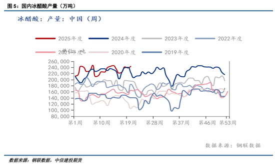 2025年,谦信荆门5月已经投产,其余新疆中和合众、上海华谊等共计330万吨产能待释放,2025年年底产能达到1665万吨,同比增长31%,预计2026-2027年,仍有350万吨新装置待投产,届时中国冰醋酸产能达到2015万吨。预计未来国内冰醋酸产量在产能投放之下维持相对高位,价格可能维持多数工厂现金流成本线附近波动,生产利润压缩明显。