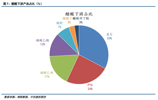 醋酸的需求与纺织、包装、农业、医药、食品等行业密切相关,下游需求方面:PTA(需求占比24%)、醋酸乙烯(需求占比17%)、醋酸乙酯(需求占比13%)占据了下游需求的 50%。