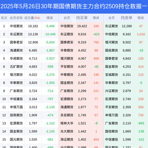 新浪期货 根据交易所数据,截至5月26日收盘主力合约30年期国债期货2509,涨跌+0.13%,成交量5.88万手,持仓数据显示前20席位呈现净空,差额头寸为2924手。