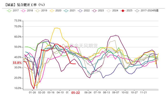 主产区复合肥企业开工率继续维持小幅下滑趋势,下游夏季肥仍未启动,复合肥整体需求偏弱,今年气候异常影响了北方小麦产量和南方经济作物用肥,复合肥供需基本面偏弱。