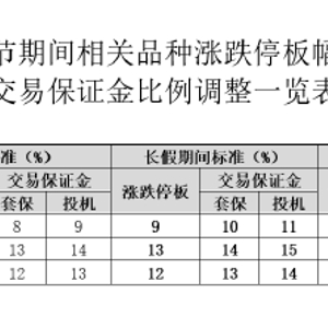 黄金期货合约的涨跌停板幅度调整为13%,套保交易保证金比例调整为14%,投机交易保证金比例调整为15%。