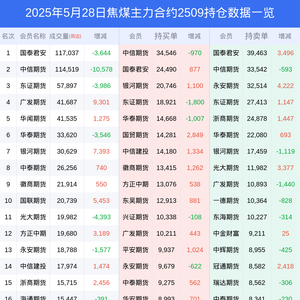 新浪期货 根据交易所数据,截至5月28日收盘主力合约焦煤2509,涨跌-2.20%,成交量53.74万手,持仓数据显示前20席位呈现净空,差额头寸为45437手。