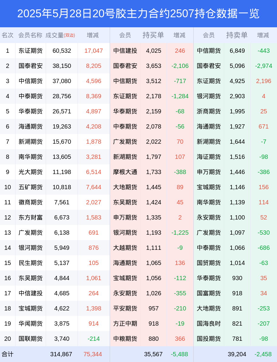 新浪期货 根据交易所数据,截至5月28日收盘主力合约20号胶2507,涨跌-4.52%,成交量20.65万手,持仓数据显示前20席位呈现净空,差额头寸为3637手。