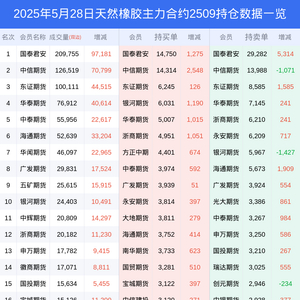 新浪期货 根据交易所数据,截至5月28日收盘主力合约天然橡胶2509,涨跌-4.36%,成交量62.77万手,持仓数据显示前20席位呈现净空,差额头寸为19241手。