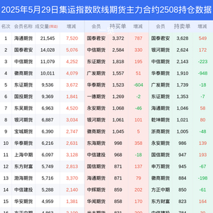 新浪期货 根据交易所数据,截至5月29日收盘主力合约集运指数欧线期货2508,涨跌+6.34%,成交量13.12万手,持仓数据显示前20席位呈现净空,差额头寸为622手。