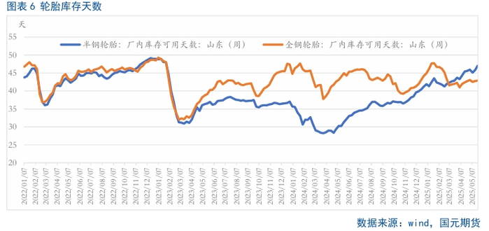 5月份受五一长假的影响,国内轮胎装置开工率呈现明显的回落,叠加贸易战的背景下,市场对于需求端存在收缩的预期,因此当月轮胎的装置开工率均值小于2024年同期。据悉,截至5月22日,国内全钢胎和半钢胎的当月装置开工率分别在57.77%和71.83%,分别较4月均值下滑了2.68和4.55个百分点,较去年同期下滑7.37和7.38个百分点。虽然五一过后,中美贸易取得阶段性的缓和,市场存在“抢出口”的预期,但是需求端整体乏力,使得宏观利好全部释放完后,市场又回归至基本面。在此影响下,轮胎库存天数呈现出回升局面,尤其是半钢胎厂内库存大幅攀升。据统计,5月22日当周,国内半钢胎和全钢胎的厂内库存天数分别达到47和42.86天,较4月底分别上涨1.4和0.13天。从后期来看,此次贸易商波及国家众多,且时间较长,因此该政策对后期全球的需求或将呈现一定的萎缩,所以终端消费并不乐观,拖累国内轮胎的内需和出口,所以进一步对上游市场形成一定的负反馈。
