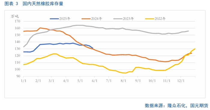 2025年1-4月份,虽然国内的天然橡胶和合成橡胶进口量高企,供应压力走高。据统计,2025年1-4月我国进口天然及合成橡胶(含胶乳)共计286.9万吨,较2024年同期的232.9万吨增加23.2%。4月当月,国内进口天然及合成橡胶(含胶乳)合计68.5万吨,较2024年同期的52.3万吨增加31%。但是在全球割胶淡季的背景下,5月初中美经贸高层会谈取得实质性进展,因此导致下游轮胎市场呈现出“抢出口”预期,使得5月份国内的天胶库存呈现出明显的去库趋势。据统计,截至2025年5月25日,国内天然橡胶社会库存130.8万吨,较5月初下滑0.39万吨,降幅3.32%,去库速度加快。从后期来看,当前“抢出口”逐渐降温,市场又回归至供需基本面,考虑到“贸易战”仍在持续的发酵,且波及国家众多,或将进一步抑制全球的消费需求,因此或将制约后期国内天胶的去库速度。
