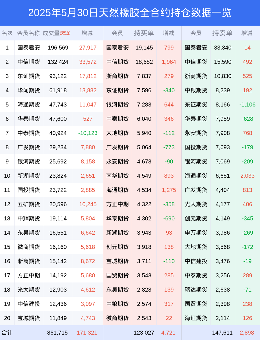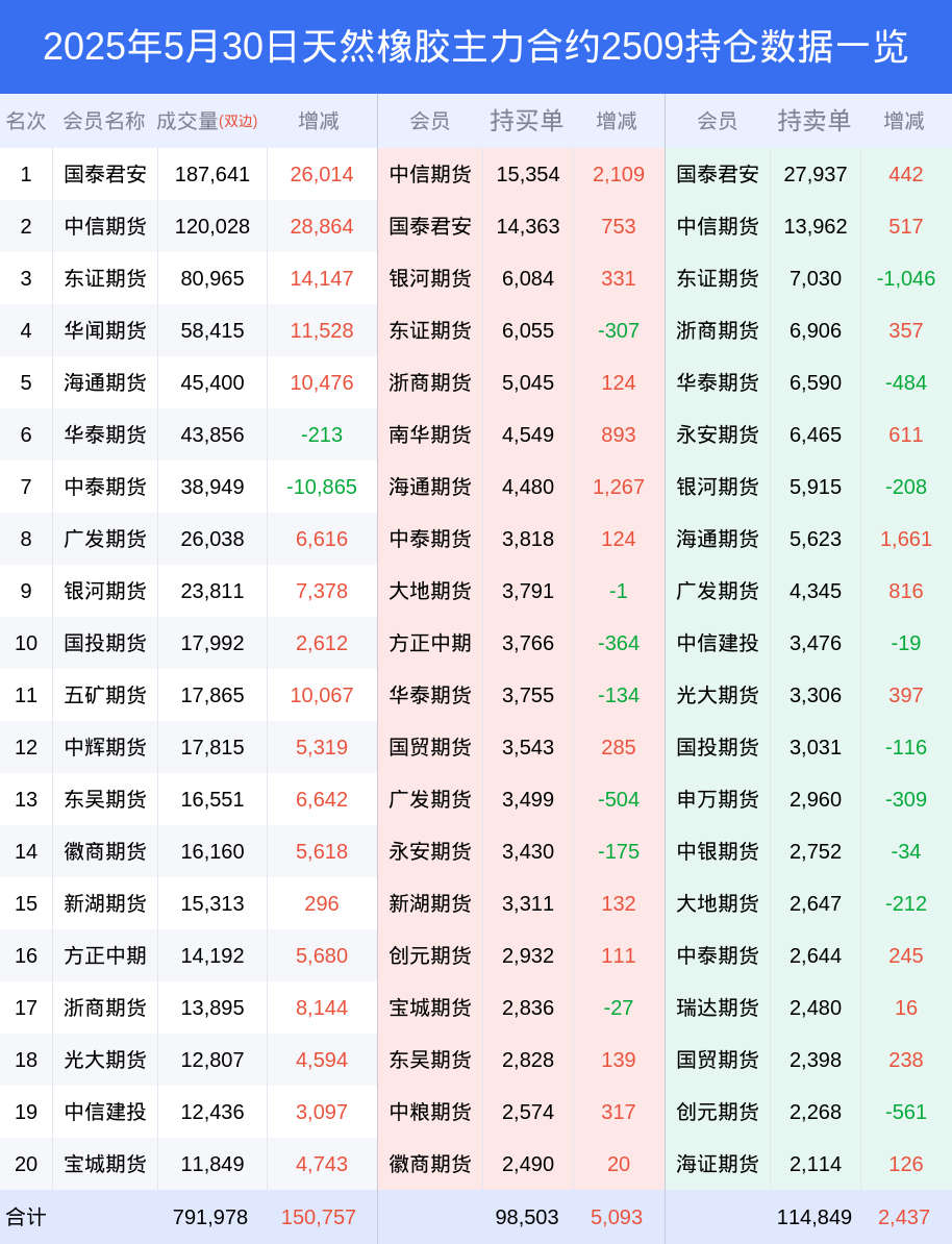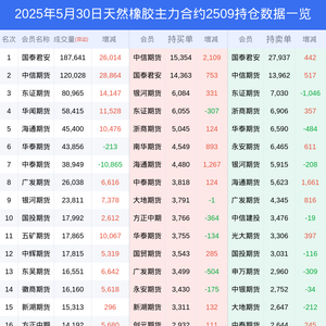 新浪期货 根据交易所数据,截至5月30日收盘主力合约天然橡胶2509,涨跌-3.14%,成交量56.85万手,持仓数据显示前20席位呈现净空,差额头寸为16346手。