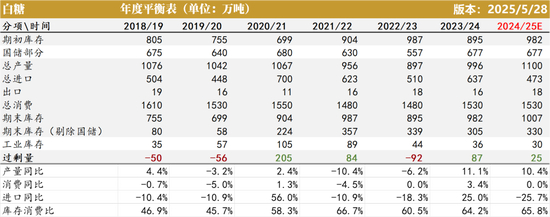 截至2025年4月底,24/25榨季全国累计产糖1110.72万吨,同比+11.6%;全国累计销糖724.46万吨,同比+26%;累计销糖率65.22%,同比增加7.5个百分点;工业库存386万吨,同比-8%。