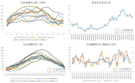 2025年4月巴西食糖出口155万吨,环比-16%,同比-18%。
