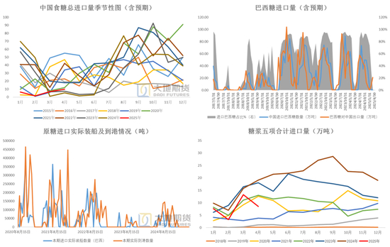 2025年4月我国总计进口食糖13.48万吨,同比+8万吨;糖浆及预拌粉进口8.54万吨,折糖约6.4万吨,同比-55%。