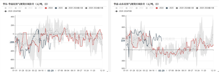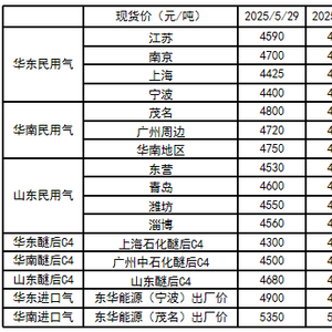 截至5月29日,华东-华南民用气现货区域价差为-209元/吨,较前一周+86元/吨;华南-山东民用气现货区域价差为224元/吨,较前一周-101元/吨;华东-山东民用气现货区域价差为15元/吨,较前一周-15元/吨。