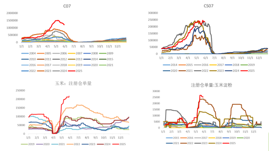 虽然5月份期价大幅回落,但现货相对坚挺,南北港、山东-东北价差走强坚挺,南北倒挂幅度大幅修复。此外,南北港库存去化显著,截至2025年5月23日,广东港内贸玉米库存共计136.7万吨,较上周增加6.30万吨;外贸库存0.5万吨,较上周减少0.20万吨;进口高粱28.9万吨,较上周减少2.80万吨;进口大麦42.5万吨,较上周减少6.00万吨。截至2025年5月23日,北方四港玉米库存共计362.2万吨,周环比减少19.9万吨;当周北方四港下海量共计45.1万吨,周环比减少16.90万吨。而深加工原料库存也处于下滑态势,截至2025年5月28日,全国12个地区96家主要玉米加工企业玉米库存总量452.7万吨,降幅0.18%。