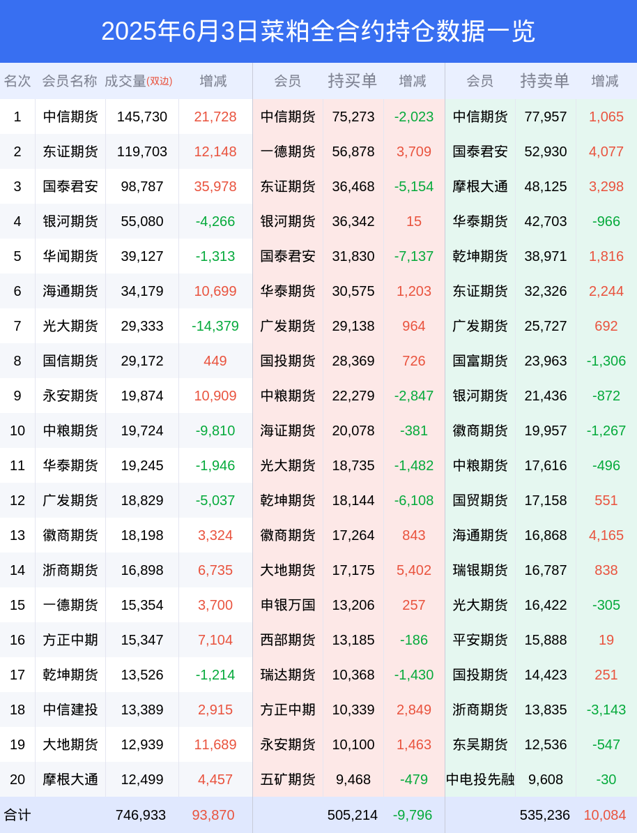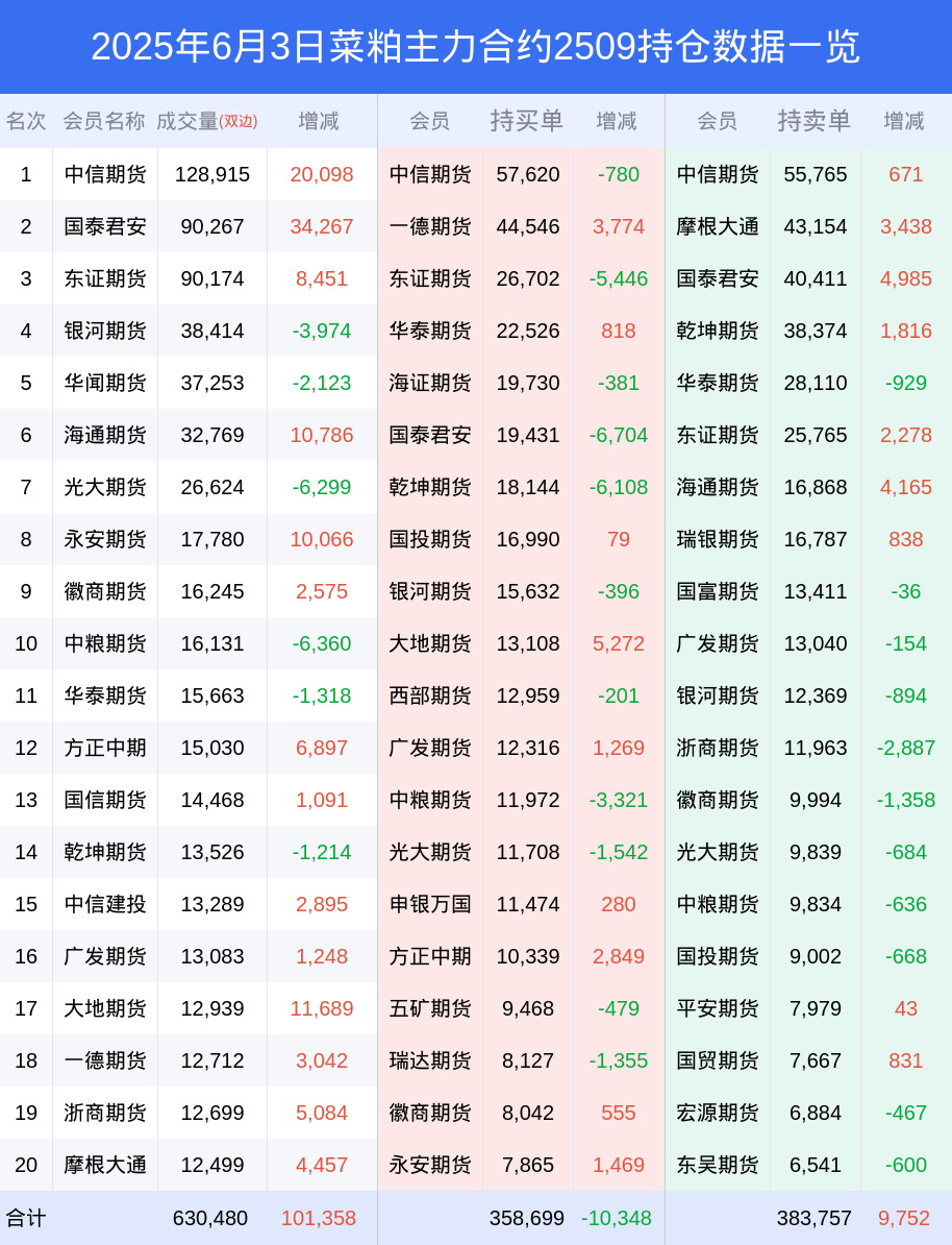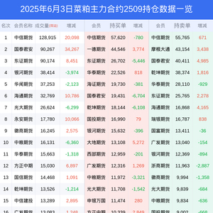 新浪期货 根据交易所数据,截至6月03日收盘主力合约菜粕2509,涨跌-2.81%,成交量48.24万手,持仓数据显示前20席位呈现净空,差额头寸为25058手。