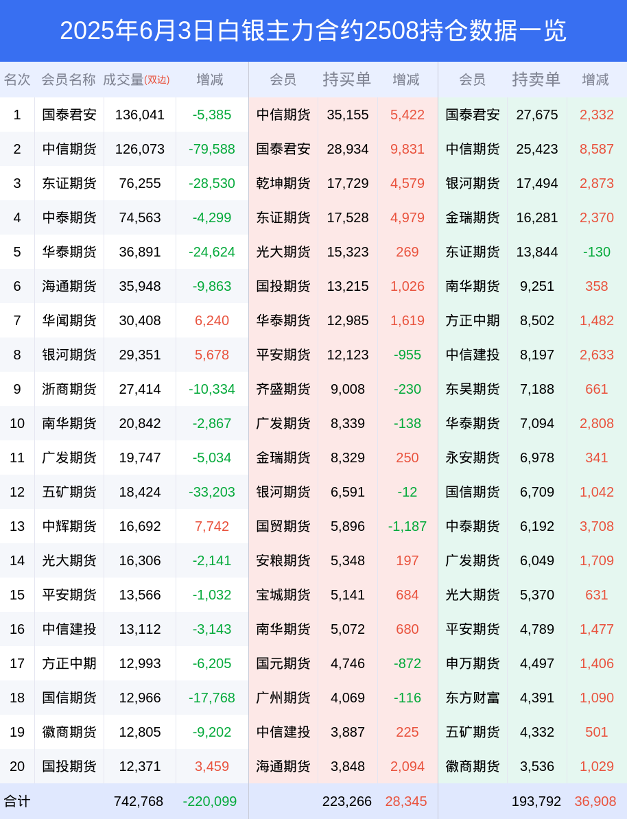 新浪期货 根据交易所数据,截至6月03日收盘主力合约白银2508,涨跌+2.85%,成交量54.76万手,持仓数据显示前20席位呈现净多,差额头寸为29474手。
