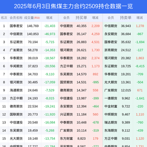 新浪期货 根据交易所数据,截至6月03日收盘主力合约焦煤2509,涨跌-3.03%,成交量61.66万手,持仓数据显示前20席位呈现净空,差额头寸为2760手。