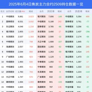 新浪期货 根据交易所数据,截至6月04日收盘主力合约焦炭2509,涨跌+5.72%,成交量4.65万手,持仓数据显示前20席位呈现净多,差额头寸为1867手。