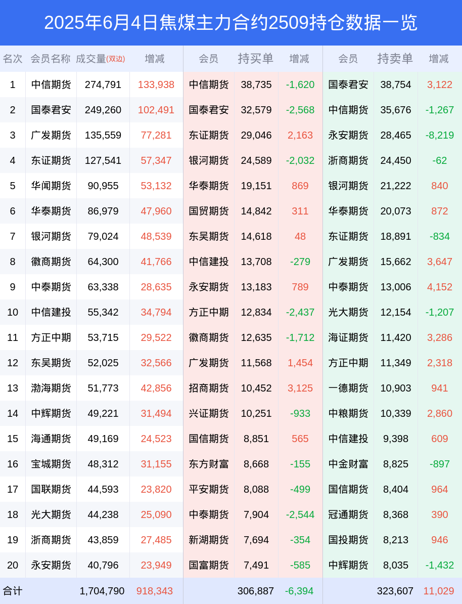 新浪期货 根据交易所数据,截至6月04日收盘主力合约焦煤2509,涨跌+7.19%,成交量142.95万手,持仓数据显示前20席位呈现净空,差额头寸为16720手。
