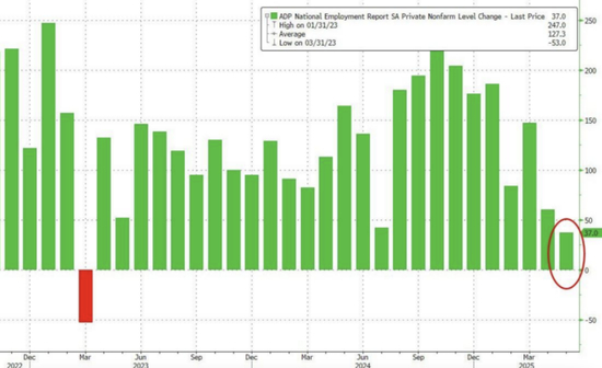6月4日晚,ADP Research公布的数据显示,美国5月ADP就业人数增加3.7万,这是自2023年3月以来的最低水平,大幅不及预期的11.4万。