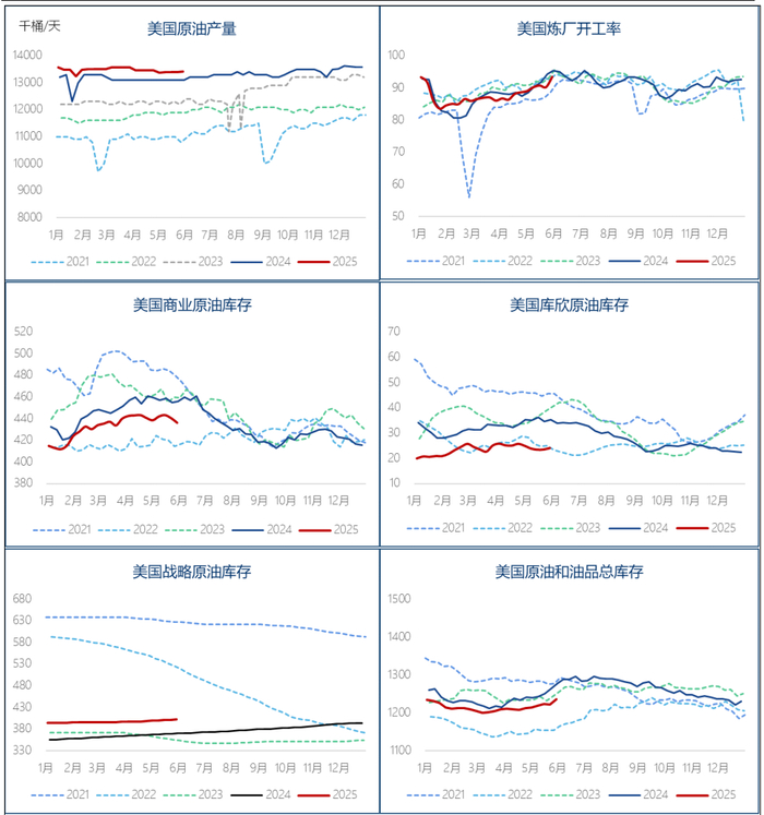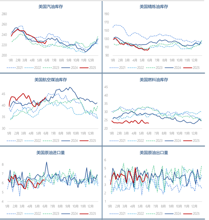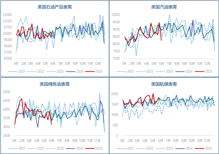 汽油库存单周激增逾500万桶,达到4月下旬以来最高水平,直接压制汽油期货价格下跌。需求端同步走弱:基于产品供应的四周移动平均值显示,汽油日均需求环比下降11.4万桶,降至五年同期最低水平。阵亡将士纪念日假期后的需求回落符合历史规律(节前零售商囤货推升需求,节后自然回调),但当前需求强度处于2019-2025年同期最低值值得警惕。馏分油库存尽管因炼厂高负荷而增加,总量仍处于22年同期最低位;其当周需求则降至2023年4月以来最低点,季节性表现为2020年以来最弱。考虑到上周数据强劲叠加假期扰动,以及市场对年初关税政策可能导致柴油消费前置的猜测,需未来数周持续观察需求真实走势。