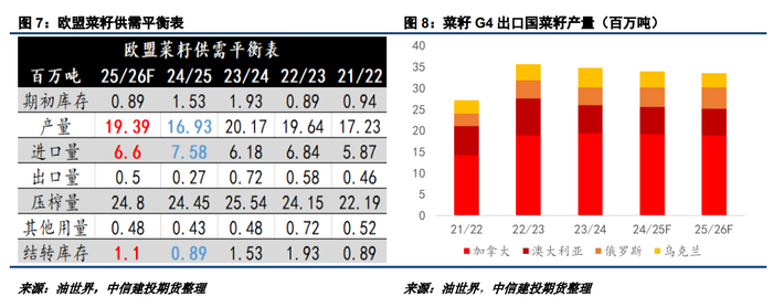 产量及压榨的快速恢复,叠加总消费的相对平稳,导致全球葵油结转库存可能从24/25年度的313万吨增加到25/26年度的370万吨。不过库存的增加也需要时间,25年8-9月全球葵油库存将处于偏低水平,俄罗斯和乌克兰可能在10-12月逐步增加压榨,因此葵油的库存压力或体现在26年的1季度。菜油方面主要关注欧盟的生柴掺混执行情况以及美国生柴原料的税收补贴情况,目前前景仍不明朗。中性视角下,假设全球菜籽压榨持平或略降,菜油面临的供应压力也将小于葵油,更多的压力可能体现在菜籽以及菜粕上。