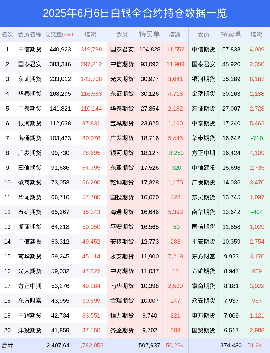 白银期货全合约总计成交196.65万手,比上一日新增148.19万手。全合约前20席位多头持仓59.24万手,比上一日增加6.45万手。全合约前20席位空头持仓44.84万手,比上一日增加5.53万手。