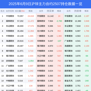 新浪期货 根据交易所数据,截至6月09日收盘主力合约沪锌2507,涨跌-1.79%,成交量24.22万手,持仓数据显示前20席位呈现净空,差额头寸为7056手。
