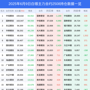 新浪期货 根据交易所数据,截至6月09日收盘主力合约白银2508,涨跌+1.77%,成交量80.28万手,持仓数据显示前20席位呈现净多,差额头寸为28988手。